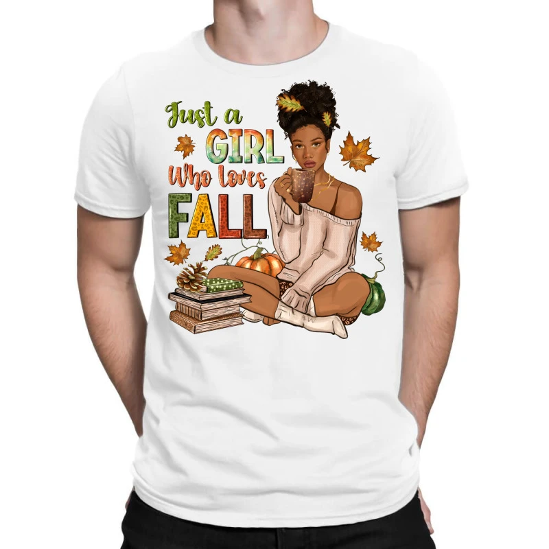 Digital printing is an amazing process that involves your artwork “Just A Girl Who Loves Fall Afro Woman” being processed by a computer and then printed directly onto the surface of your product. Digital printing is not a heat transfer or applique, as the ink directly adheres to the fabric of your shirt. Each printing process has its strengths, and our artwork team will weigh these when deciding which to use for your art.